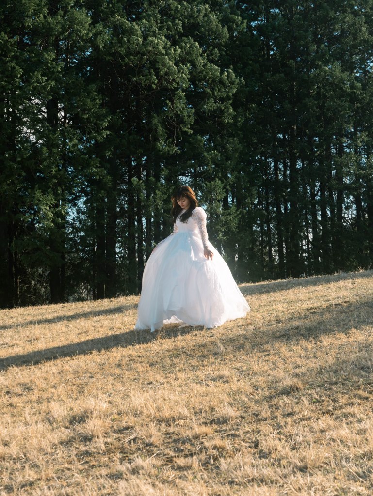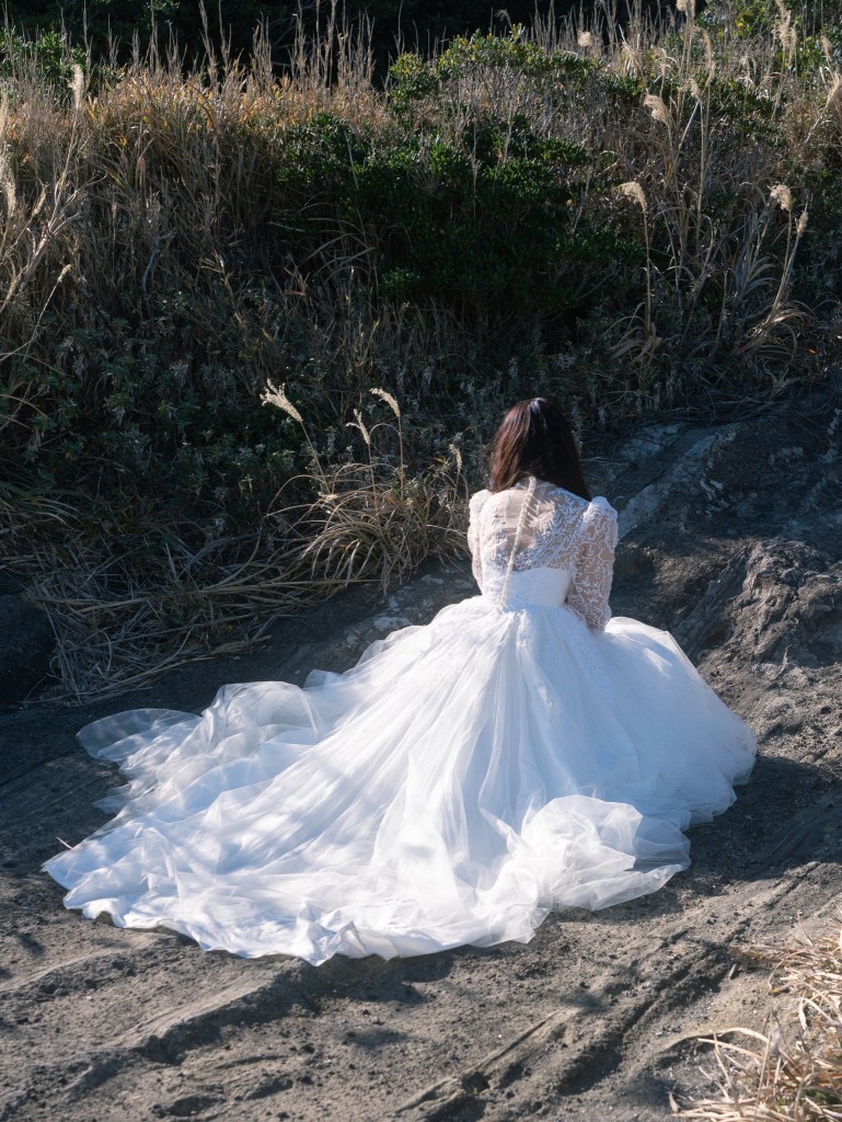オリジナルの刺繍が全面に施されたウェディングドレス。背中にはパールが付いています。